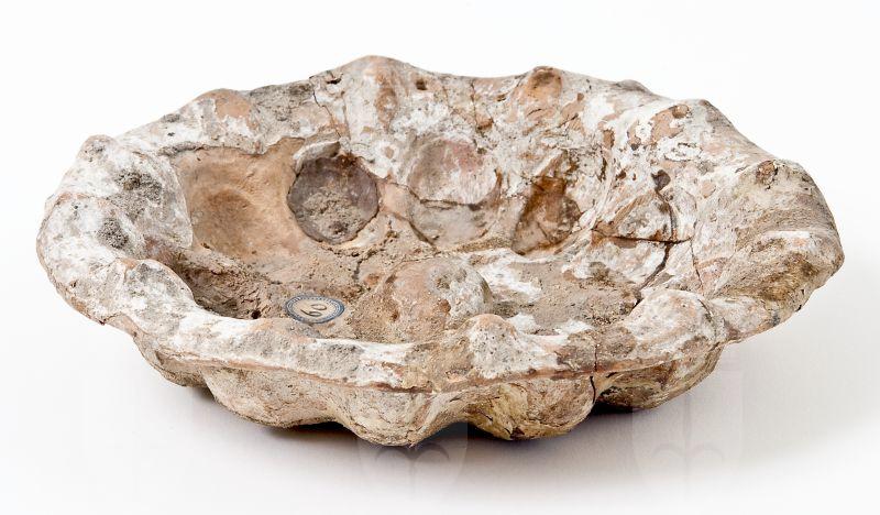 Phiale mesonfalica baccellata apula argentata. Bassa vasca emisferica, orlo ondulato ed estroflesso. All’interno, pomello rilevato al centro, baccellature concave profilate da un bordo incavato, tra le quali si dispongono, in corrispondenza dell’orlo, testine in rilievo; su un lato dell’orlo, due fori per la sospensione. La phiale presenta una spessa ingubbiatura biancastra di caolino a imitazione dei prototipi argentei.