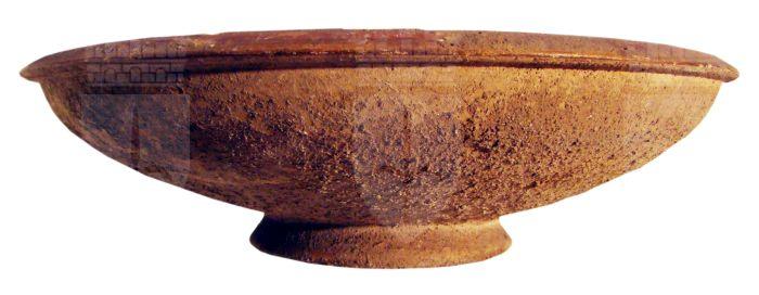 Patera con vasca bassa e ampia, a profilo convesso. Labbro obliquo, piede troncoconico. Decorazione in vernice bruna: dipinto l’orlo con motivo a fasce concentriche nere e brune assai sbiadite e coperte da incrostazioni.
