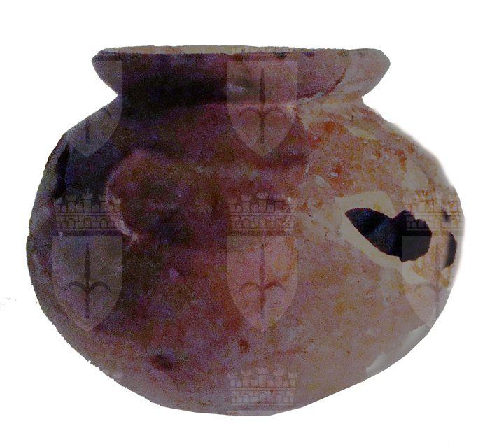 Pisside/vasetto acromo a corpo sferoidale, leggermente piriforme, collo inesistente e bocca estroflessa, piede svasato ad anello, tracce di vernice bruna.