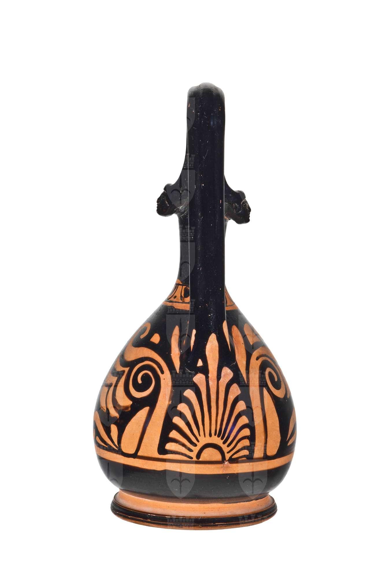 Epichysis apula a figure rosse piriforme, con becco semicilindrico allungato e ansa sormontante a nastro con protomi femminili all'attacco superiore. Donna seduta vestita di chitone con sperchio e phiale. Antefissa a palmetta sotto l'ansa.