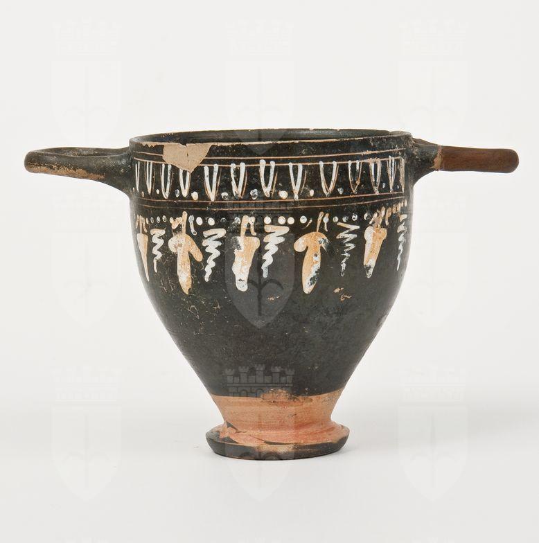 Skyphos a vernice nera, tendente all'olivastro, con sovraddipinture in bianco e giallo ed incisioni. Orlo leggermente estroflesso, corpo rastremato verso il basso, anse a bastoncello, impostate orizzontalmente sotto l'orlo, basso piede ad anello sagomato. Lato A: Sotto l'orlo, tra due coppie di linee incise, sequenza di ovuli incisi e dipinti con punti in bianco, grappoli, pampini e viticci, in bianco e giallo, pendenti da una fila di punti, in giallo su base bianca. Lato B: Sotto l'orlo ramo secco con stelo inciso e foglie puntiformi.
