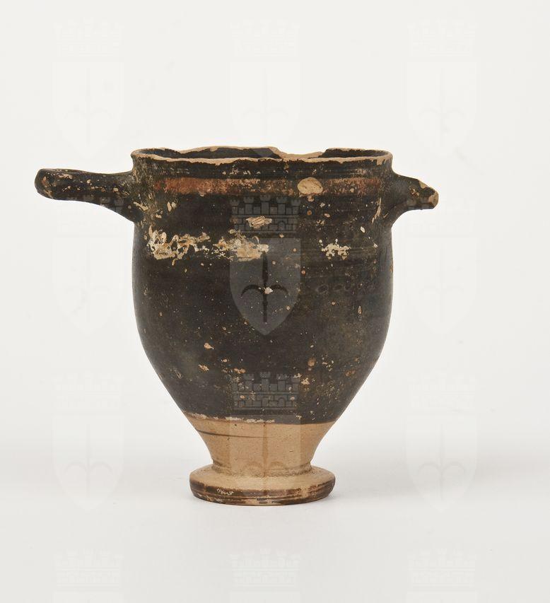 Skyphos a vernice nera, tendente al rosso sul lato B, con sovraddipinture in bianco, giallo e rosso. Orlo leggermente estroflesso, corpo rastremato verso il basso, anse a bastoncello, impostate orizzontalmente sotto l'orlo e ad andamento quadrangolare, basso piede a tromba con incavo centrale. Ciò che rimane della decorazione è una fascia in rosso amaranto ed una linea, presumibilmente, in giallo su base bianca. Sembrano inoltre leggersi le impronte in negativo lasciate dai pigmenti del motivo decorativo ad onda.