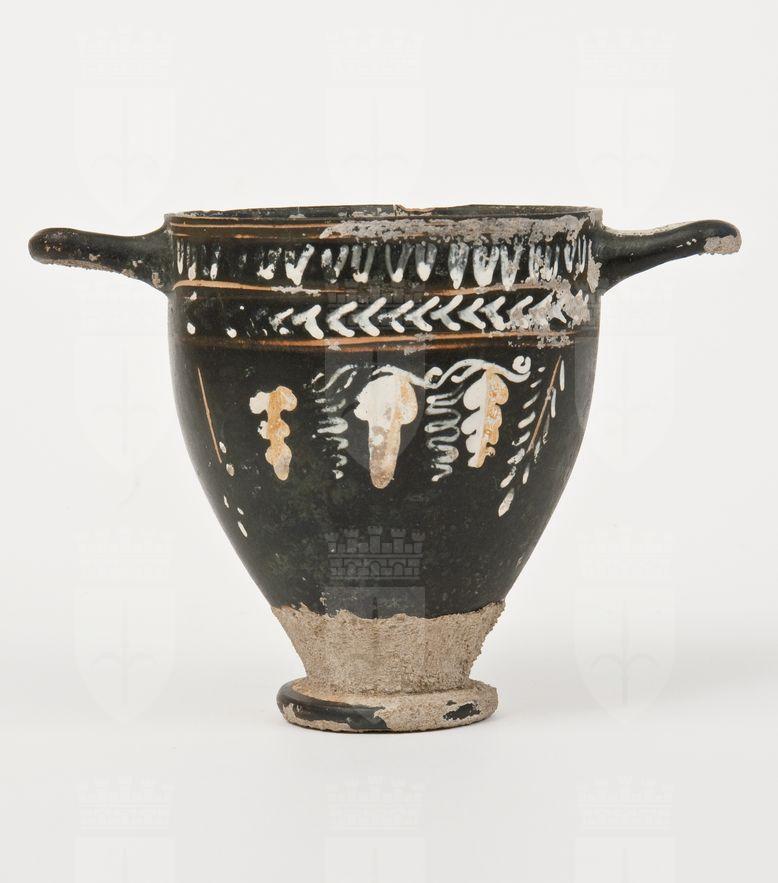 Skyphos a vernice nera opaca con sovraddipinture in bianco crema e giallo ed incisioni. Orlo leggermente estroflesso, corpo rastremato verso il basso, anse a bastoncello impostate orizzontalmente sotto l'orlo e andamento quadrangolare, basso piede ad anello sagomato. Lato A: Sotto l'orlo, tra le coppie di linee incise, sequenza di ovuli dipinti e Chevron in bianco, seguiti da un tralcio di vite reso attraverso un grappolo centrale, pampini e viticci, dipinti per metà in bianco e metà giallo, tra due rami di alloro con stelo inciso, disposto obliquamente verso l'interno. Lato B: Sotto l'orlo, ramo di ulivo selvatico.