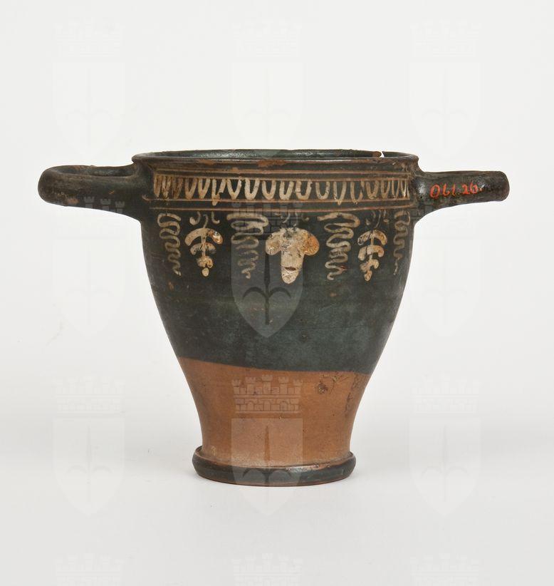 Skyphos a vernice nera opaca, tendente all'olivastro, con sovraddipinture in bianco crema e giallo e incisioni. Orlo leggermente estroflesso, corpo rastremato verso il basso, anse a nastro orizzontali, basso piede ad anello. Lato A: Sotto l'orlo tra due coppie di linee orizzontali incise, sequenza di ovuli dipinti, dalla seconda linea incisa scendono un grappolo centrale affiancato da germogli e foglie di vite, dipinti per metà in bianco e metà in giallo. Lato B: Sotto l'orlo ramo di alloro con stelo inciso e foglie in bianco crema.