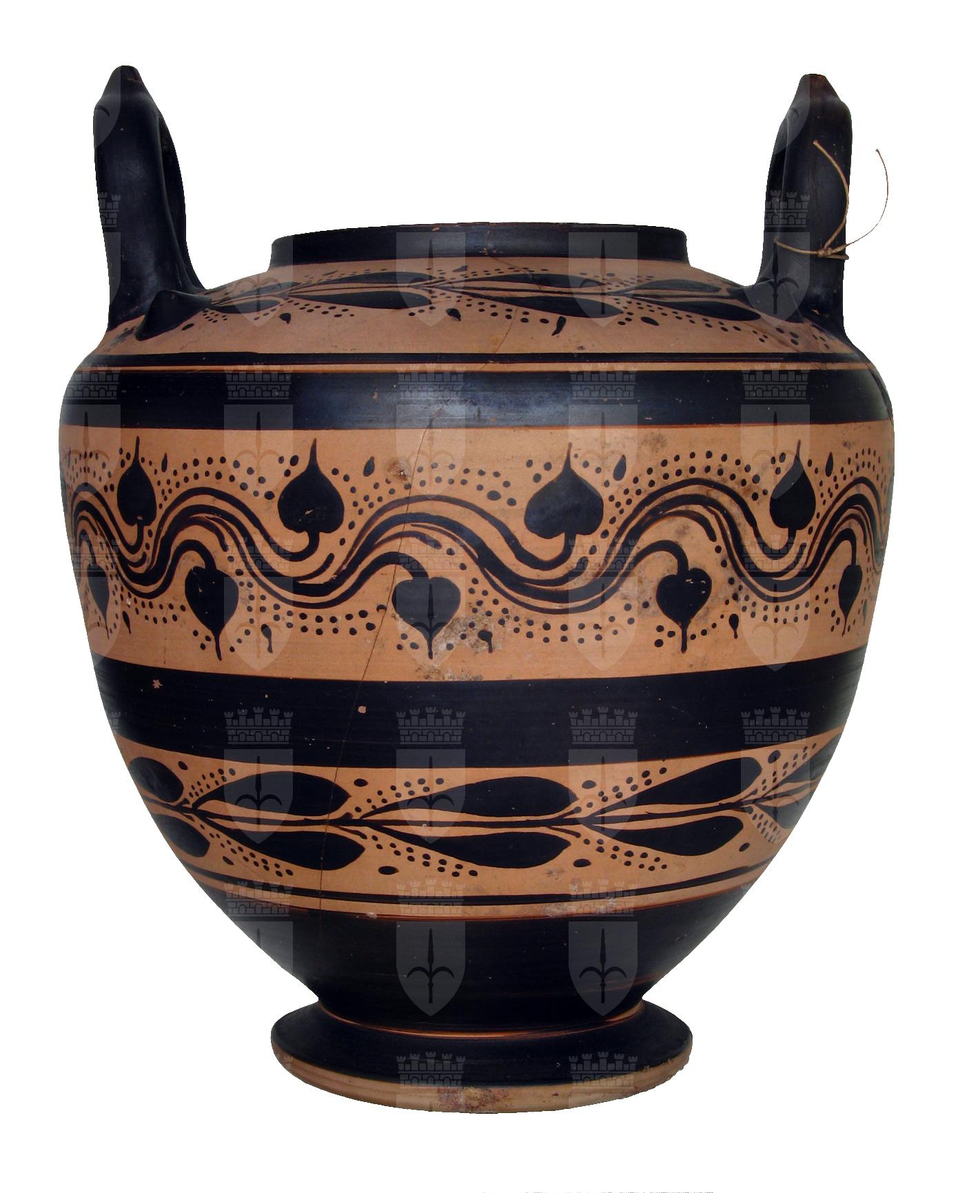 Stamnos a figure nere con decorazione a fasce alternate nere e serti d'edera e alloro con corimbi.