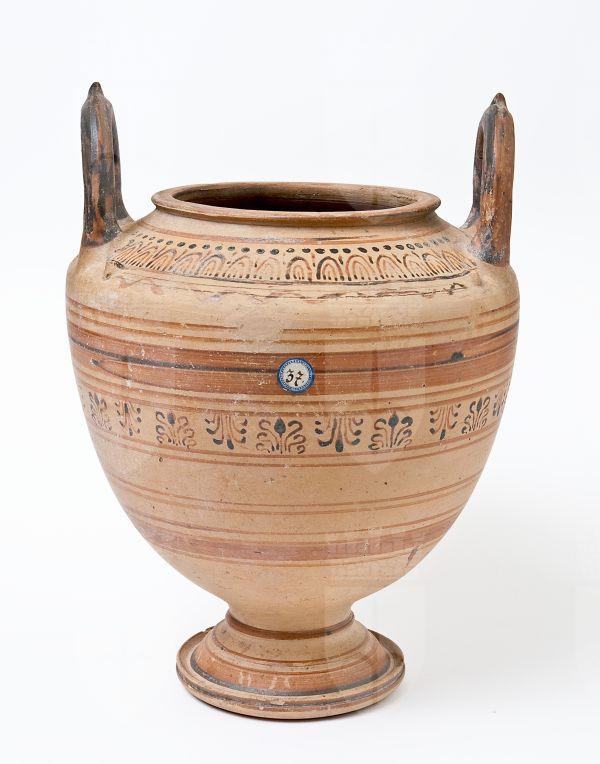 Stamnos con corpo globoso, rastremato verso il basso. Labbro svasato e orlo appiattito, larga imboccatura, anse verticali sormontanti impostate sulla spalla a profilo teso, con piede a tromba modanato con base a disco. Decorazione in bruno e rosso diluito, su fondo acromo: sulla spalla, un fregio inquadrato da due filettature e costituito da una fila di cerchi pieni e una di ovoletti a linee concentriche, separati da linee verticali, altre due linee concentriche parallele, con motivo a tremolo; sul corpo, linee e fasce di diverso spessore disposte sull’intera superficie, con fregio di palmette alternate; sul piede, linee e fasce di diverso spessore; dipinti l’orlo e le anse.