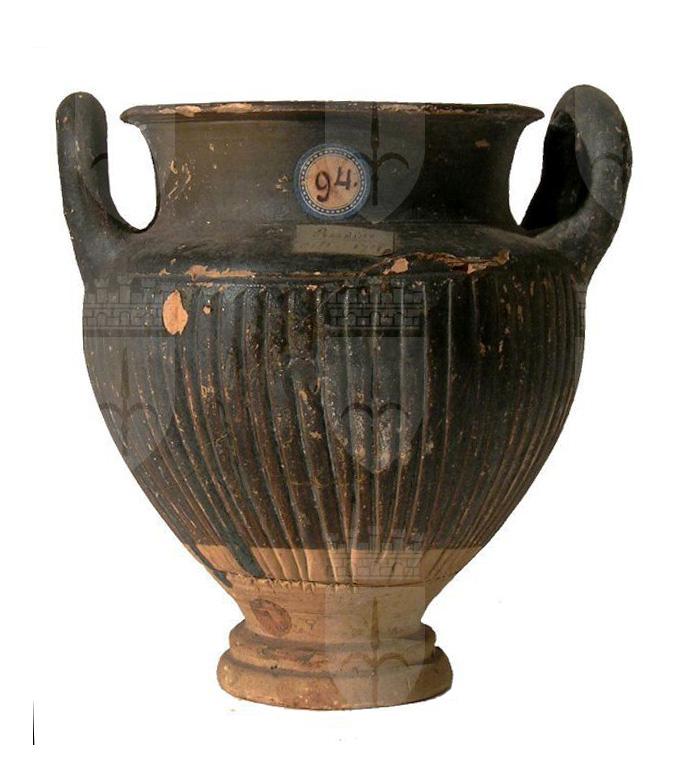 Stamnos a corpo baccellato con due anse arcuate verticali su alto piedistallo a due elementi; vernice nera con sovraddipintura perduta con coperchio baccellato.