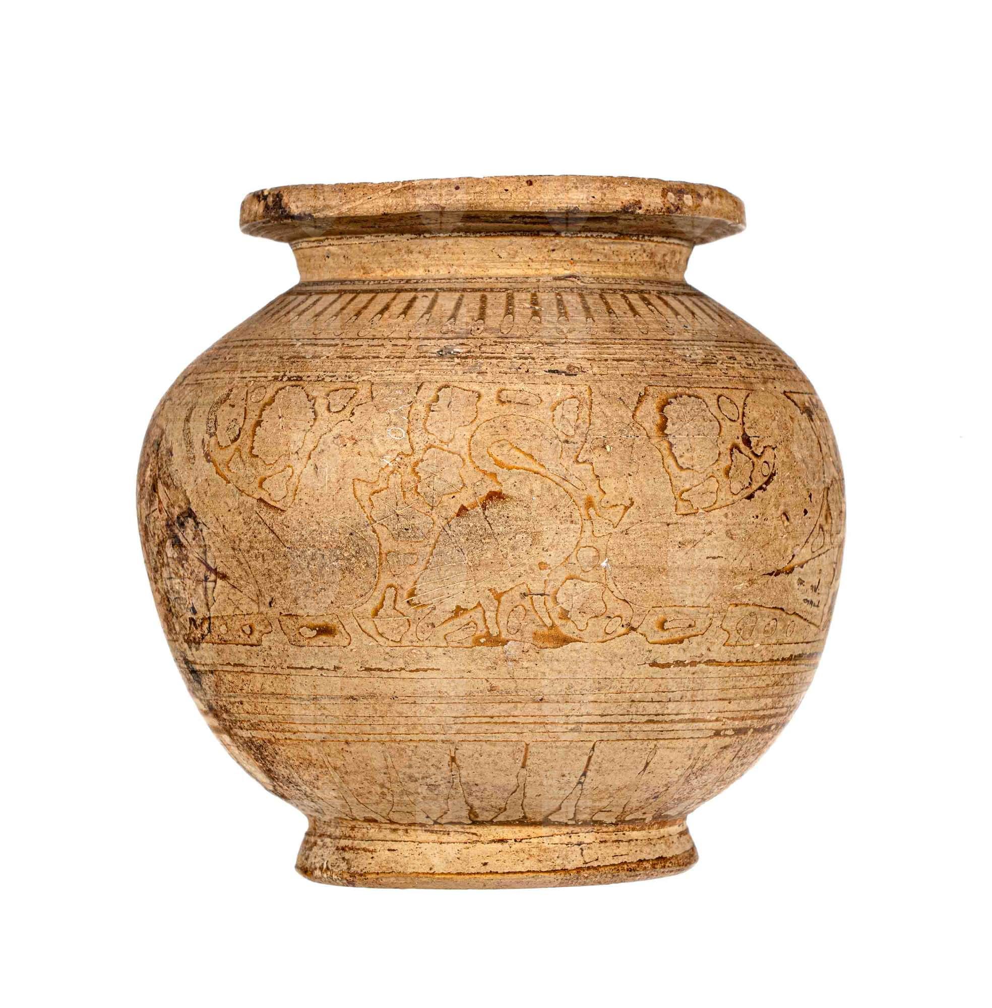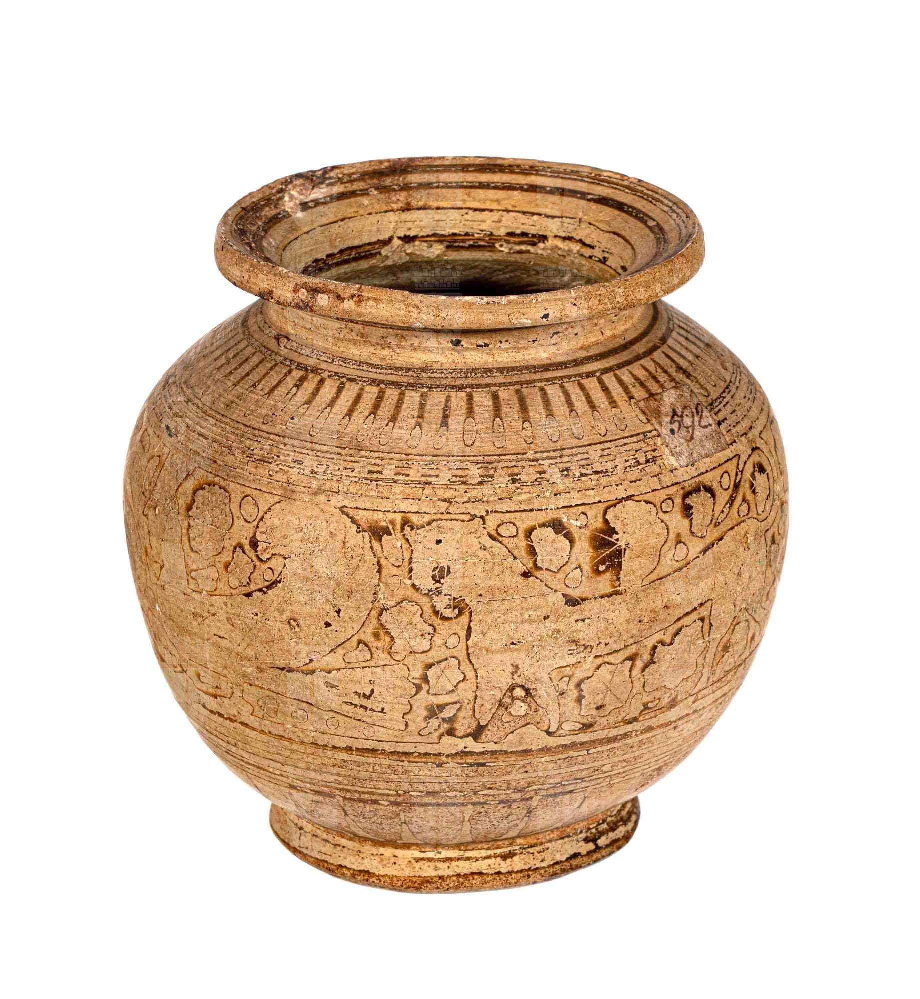 Pisside corinzia a corpo sferico, bassa base e orlo estroflesso, mancante del coperchio; decorazione a fasce con una zona di animali: due sirene e due pantere con in mezzo cigno. Nel campo rosette; sopra e sotto raggiere di petali.