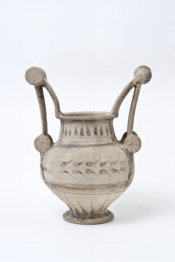 Trozzella in ceramica messapica. Orlo estroflesso e appiattito, basso collo troncoconico, a profilo leggermente convesso, corpo globoso rastremato verso il basso, con anse verticali sormontanti, impostate sull’orlo e sulla spalla, provviste di doppia coppia di dischi (“trozze”), di cui quelli superiori sono di maggiori dimensioni; basso piede a disco. Decorazione monocroma in nero su fondo naturale di argilla; su entrambi i lati, pannelli sul collo e sulla spalla inquadrati da fasce parallele, in cui campeggiano tralci d’edera stilizzati; sull’orlo, tratti; nella parte inferiore del vaso, raggiera di petali.