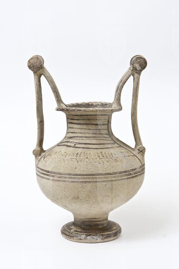 Trozzella in ceramica messapica. Orlo estroflesso e appiattito, alto collo cilindrico, a profilo lievemente concavo, corpo globoso, con anse verticali sormontanti, impostate sull’orlo e sulla spalla, provviste di doppia coppia di dischi (“trozze”), di cui quelli superiori sono di maggiori dimensioni; piede a disco, unito al corpo mediante fusto. Decorazione monocroma in bruno-nerastro, su fondo naturale di argilla, con piede dipinto in bruno; sul collo, linee orizzontali diritte; sulla spalla, una serie di pannelli definiti da linee parallele, in cui su un lato campeggiano palmette isolate, mentre sull’altro un ramo di ulivo. All’altezza del ventre una fascia a tre linee parallele; sulla parte inferiore del fusto, fasce e piede dipinto; sull’orlo, tratti; sulle anse, linee verticali, dischi superiori dipinti, sui dischi inferiori, linee incrociate.