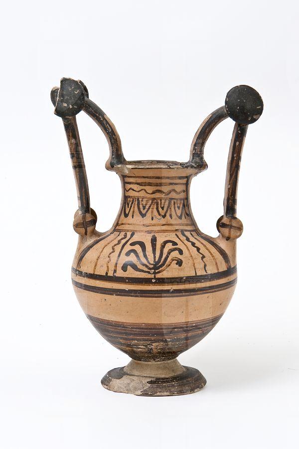 Trozzella in ceramica messapica. Orlo estroflesso, alto collo troncoconico, a profilo concavo, corpo allungato a profilo ovoidale, con anse verticali sormontanti, impostate sull’orlo e sulla spalla, provviste di doppia coppia di dischi (“trozze”), di cui quelli superiori sono di dimensioni maggiori; alto piede troncoconico e spalla distinta. Decorazione monocroma in bruno-nerastro su fondo rosso, con piede, interno dell’orlo e anse dipinti in nero-brunastro; sul collo, pannello con linee orizzontali tremule, ovoli e lunghi pendenti; sulla spalla, un ramo d’edera con corimbi su un lato, mentre sull’altro un pannello con al centro un’antefissa a palmetta e linee tremule verticali ai lati. Nella parte inferiore del corpo, fasce parallele; sulle anse, tratti; dischi superiori dipinti, sui dischi inferiori linee incrociate.