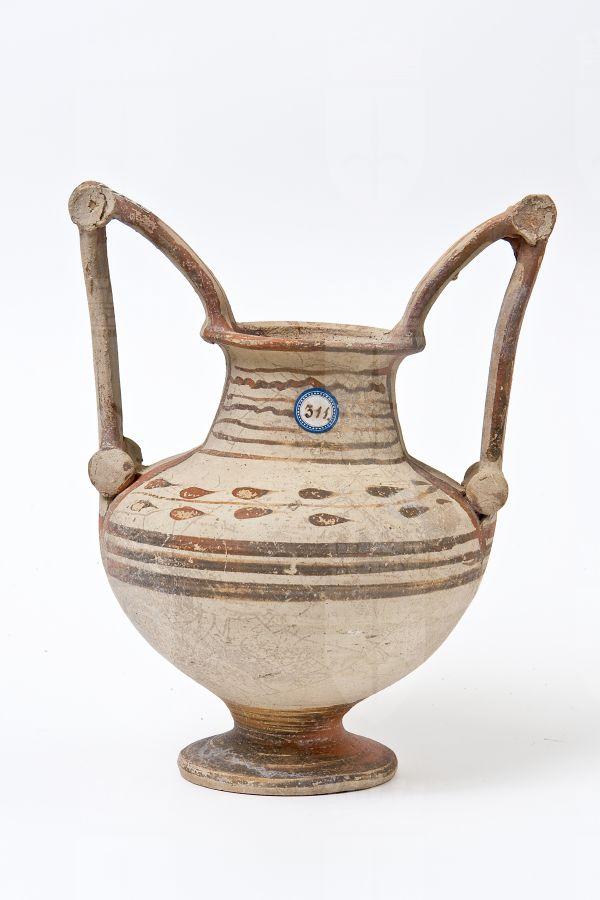 Trozzella in ceramica messapica. Orlo estroflesso e appiattito, alto collo cilindrico, a profilo lievemente concavo, corpo globoso, con anse verticali sormontanti, impostate sull’orlo e sulla spalla, provviste di doppia coppia di dischi (“trozze”) di eguali dimensioni; piede a disco, unito al corpo mediante fusto. Decorazione monocroma in rosso, su fondo naturale di argilla, con piede e fusto interamente dipinti; sul collo, linee orizzontali diritte e “a tremulo”; sulla spalla, un ramo d’ulivo in entrambi i lati. All’altezza del ventre una fascia a tre linee parallele; sull’orlo, tratti; sulle anse, linee verticali.