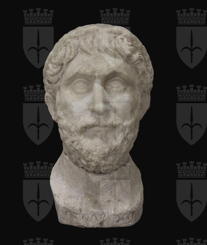 Testa maschile a cui il gioco movimentato dei capelli spioventi a fiamma sulla fronte e a riccioli ai lati, della barba e dei baffi acconciati sul tipo dell’imperatore Antoniono Pio, accresce la linea tormentata del volto. Le sopracciglia rilevate, accompagnando la forte arcata orbitale, formano sulla fronte un complesso di piccole rughe ondulate e danno al volto un’espressione di doloroso stupore. Gli occhi grandi e trasognati si aprono sulle guance stanche e segnate. La bocca ha le labbra strette e la parte superiore lunga e pronunciata. L’insieme è trattato con un certo impressionismo che cura maggiormente la visione frontale. Di lato la lavorazione è trascurata, specie dalla parte destra, dove l’orecchio sembra appena abbozzato e la corona di mirto che adorna la chioma non è ben definita nelle sue parti. Né, d’ambedue le parti, gli orecchi si staccano, ma lievemente sporgenti, formano tutt’uno con la parte posteriore del capo, dove la trattazione dei capelli va man mano diminuendo d’intensità e la corona si riduce ad una semplice sporgenza. Il naso è stato aggiunto da un restauro posteriore e così pure il breve tratto di busto in gesso con la scritta in greco Tolomeo.