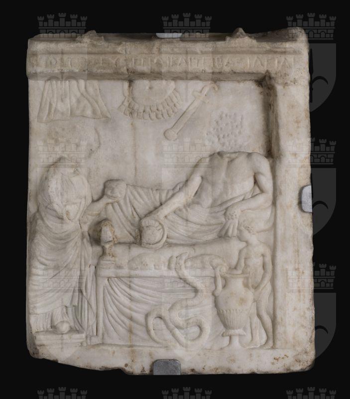 Porzione destra di stele a naiskos in marmo pentelico con sima e antefisse. Lateralmente il rilievo è inquadrato da pilastri piatti con capitello - che reggono un architrave - dei quali si conserva solo quello di destra. Il rilievo mostra l'eroe seminudo steso su una kline mentre regge con la destra una patera rilavorata con muso di pantera. Davanti alla kline, in piedi, si trova una donna di tre quarti con in mano due oggetti rilavorati, una maschera e un calice. Sia l'uomo che la donna sono acefali perché le teste sono state scalpellate. Sopra la kline, sullo sfondo, sono appesi una tunica, una corazza e una spada. Davanti al personaggio recumbente vi sono un serpente, un cratere a volute e un pais nudo. Le lettere presentano evidenti tracce di rilavorazione moderna, riscontrabili soprattutto nel sigma finale del nome del dedicante, nell’ eta dell’articolo divenuto epsilon e nel lamba di BASILEIA trasformato in A.