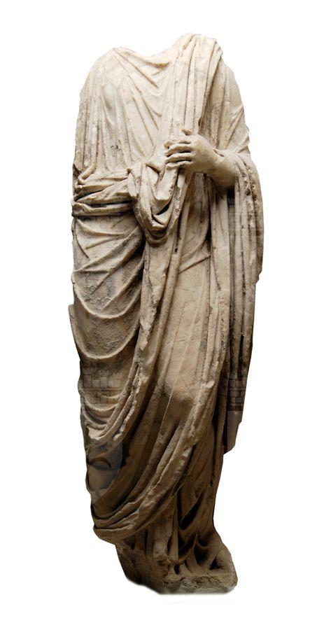 Statua, mancante della testa e del braccio destro, di grandezza poco inferiore al normale, raffigura un personaggio stante dall'ampia toga che scende fino alle caviglie e che indossa ai piedi calceus patricius. Il retro non è lavorato.