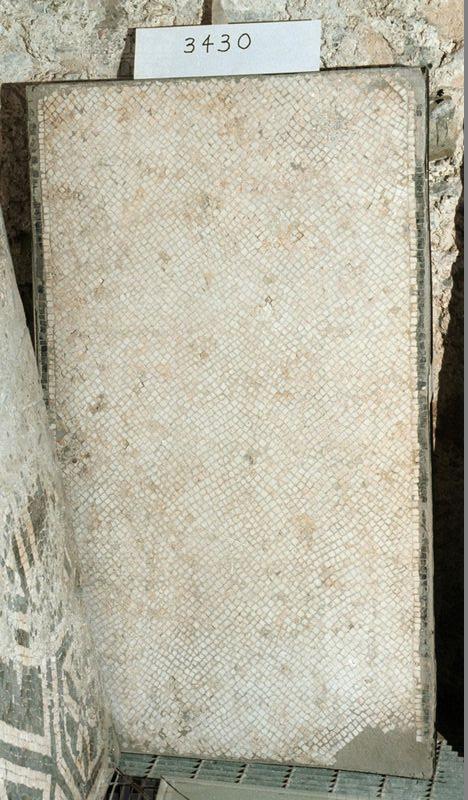 Un pannello (vedi anche inv. 3250) del mosaico della prima fase edilizia appartenuto all’ambiente G, aperto sul portico del giardino, aveva questo pavimento mosaicato a tessere bianche con al centro una stretta fascia a tessellato nero con fitti inserti di marmi venati e ciottoli fluviali bianchi e rossi screziati, disposti irregolarmente.
