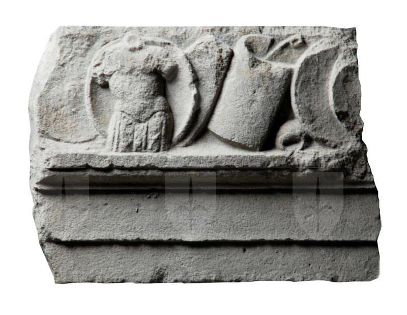 Sopra l’architrave, articolata in due fasce, una cornice con listello e gola rovescia, e un fregio d’armi a rilievo continuo. Da sinistra: un clipeus, visto internamente, con davanti una corazza anatomica con maniche a strisce di cuoio e una fila di pteryges terminanti a frangia; uno scudo rettangolare; uno scudo semicilindrico; un oggetto indefinibile (forse un drappeggio?) e due clipei sovrapposti. Contiguo a inv. 14369