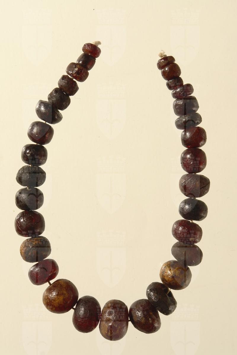 Collana d'ambra color rosso rubino formata da 31 vaghi sferoidali schiacciati (al ritrovamento erano 35), di misura decrescente verso le estremità. Presenta analogie con quella della tomba 2667 della stessa necropoli.