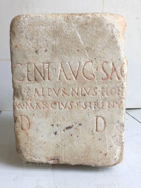 Piccola base parallelepipeda, priva di cornice e modanature, in marmo rinvenuta a Roma nel 1891. La rubricatura delle lettere non è antica. Sono visibili tre fori nella faccia superiore, dei quali quello centrale conserva residui di piombo per il fissaggio, mentre le altre due sono di reimpiego, come il foro nella faccia posteriore, pesantemente rilavorata.La base originariamente recava fissato nella faccia superiore il vero oggetto della dedica di Gaio Calpurnio On... e Marco Marcio Sirino, una statuetta o un altro oggetto in metallo, poi andato perduto. Il tono della dedica ci fa intuire che alla famiglia imperiale è attribuita una valenza divina, non diversa da quella goduta dai singoli imperatori che non solo dopo morti ma spesso anche da vivi erano considerati e onorati come veri e propri dei.