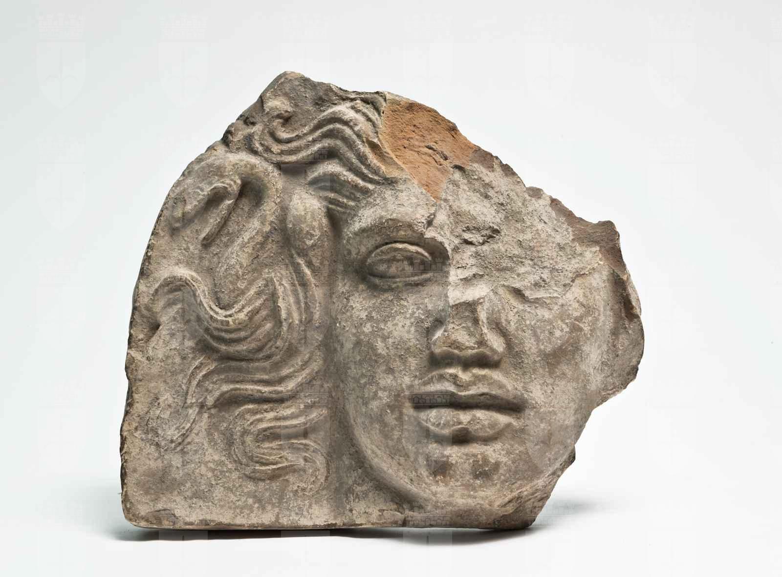 Argilla color beige, in frattura colore arancione scuro. La forma del viso e delle labbra e ciò che resta del naso assomigliano molto a quelli dell’antefissa inv. 2370; simili sono anche le chiome, rese in modo abbastanza plastico, e il serpente. Non si esclude che sia stata usata la medesima matrice, ma lo stato incompleto delle due antefisse non consente confronti puntuali e decisivi, per quanto le somiglianze siano davvero notevoli, soprattutto nelle labbra, piuttosto carnose e nel taglio dell’occhio sinistro. Anche le misure del viso e della bocca (rispettivamente cm 10,5 e cm 4,3) coincidono.