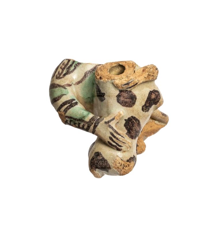 Della figura umana rimane il busto con un braccio che trattiene al petto un animale quadrupede dal manto pezzato, forse un cane.