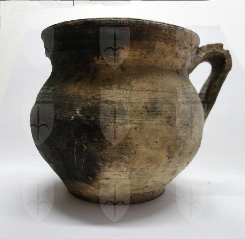 Olletta integra ad alto orlo svasato sagomato; labbro arrotondato; ventre sferico, rastremato verso il fondo; fondo piatto; ansa a nastro con innesti in corrispondenza della gola e del punto di massima espansione del ventre. Conserva internamente la vetrina trasparente impermeabilizzante.