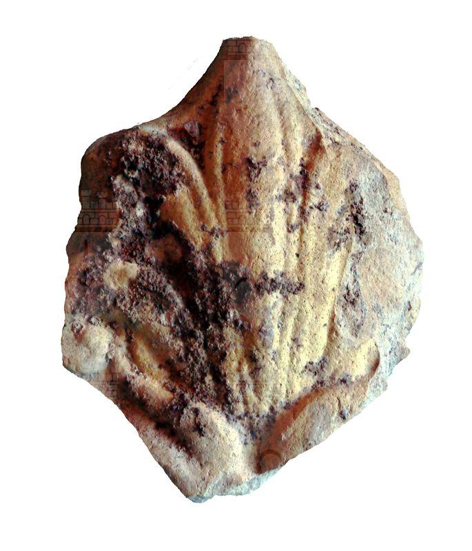 Frammento di parte superiore di antefissa di forma ogivale con ondulazioni nella parte superiore in corrispondenza della palmetta a cinque lobi. Rimangono le corna delle due protomi caprine contrapposte.