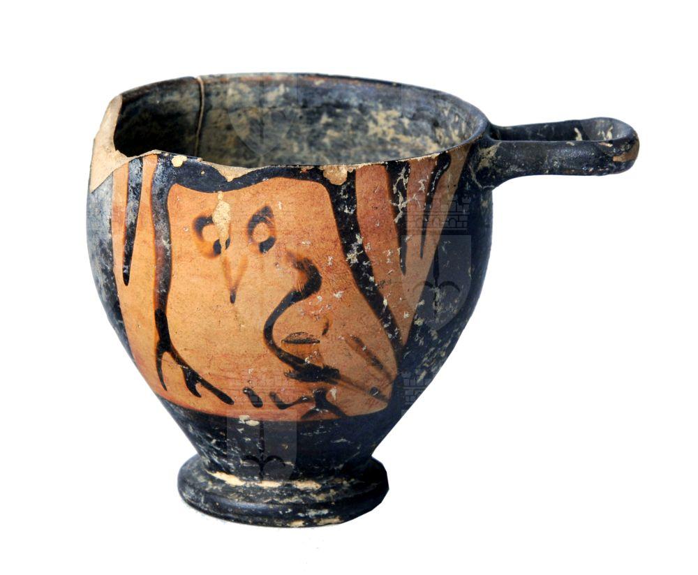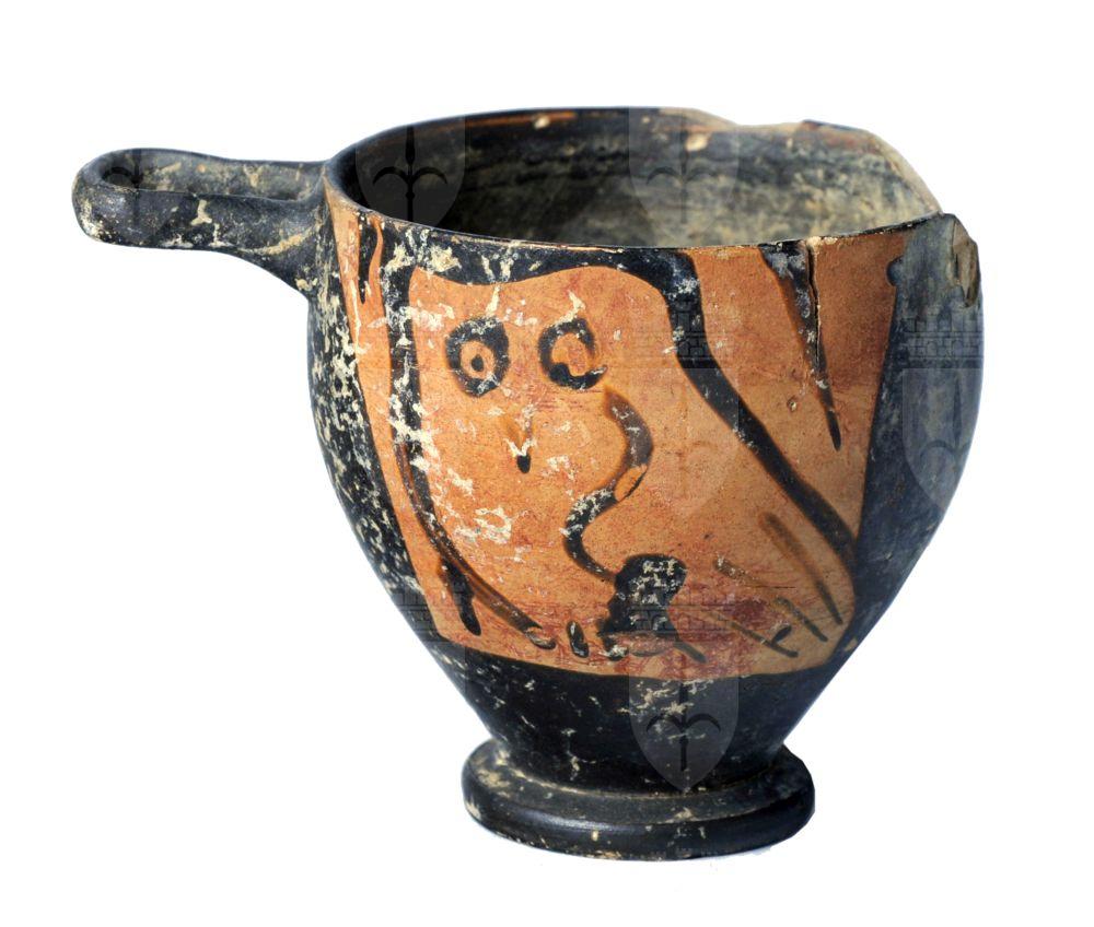 Skyphos apulo a figure rosse. Lato A e B: civetta tra foglie lanceolate.