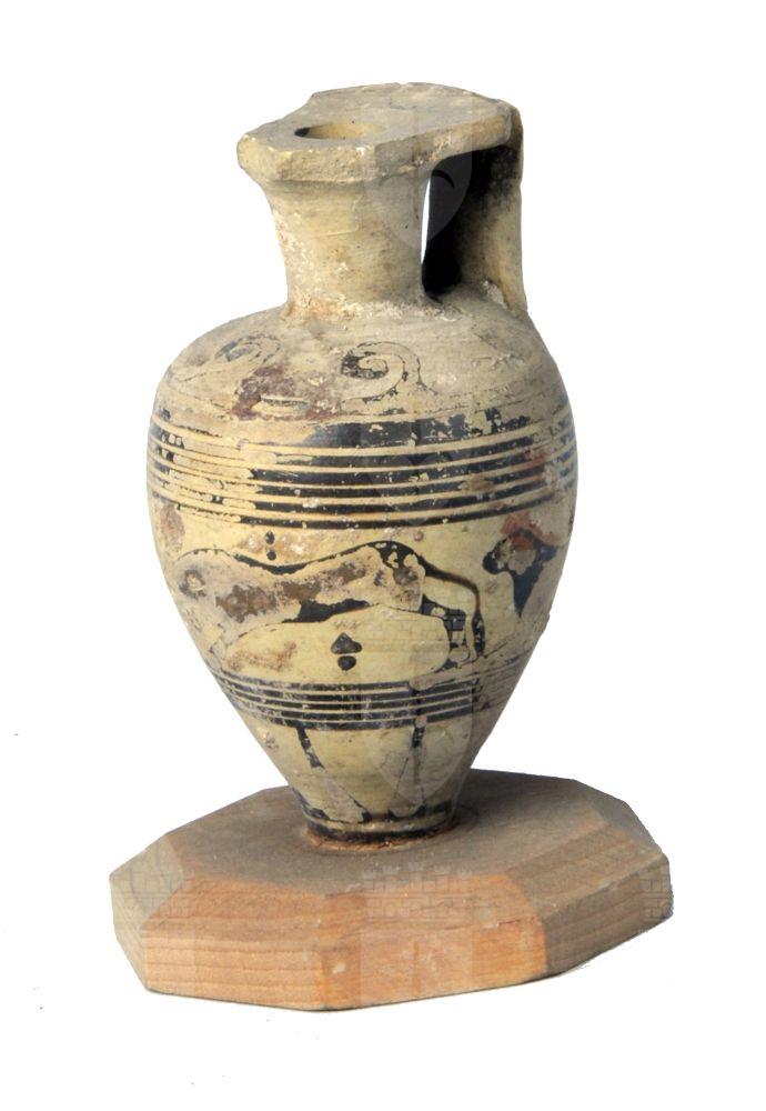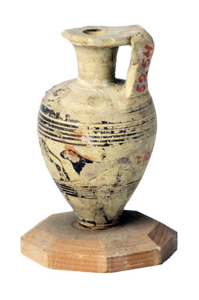Aryballos piriforme rastremato verso il puntale etrusco-corinzio a fasce con animali/cani in corsa.