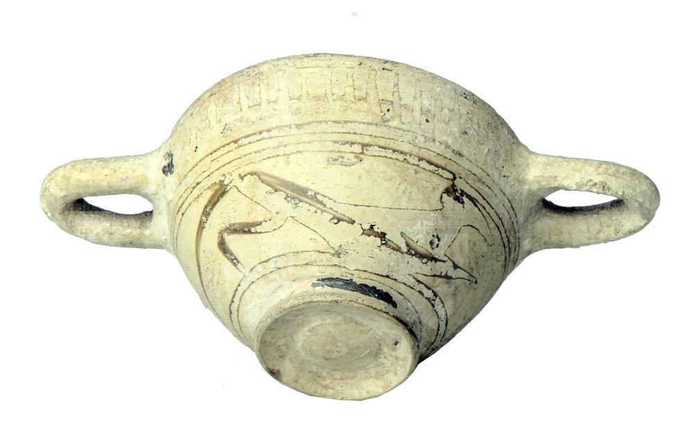 Skyphos miniaturistico corinzio a fasce con decorazioni figurate molto evanidi: due animali in corsa.