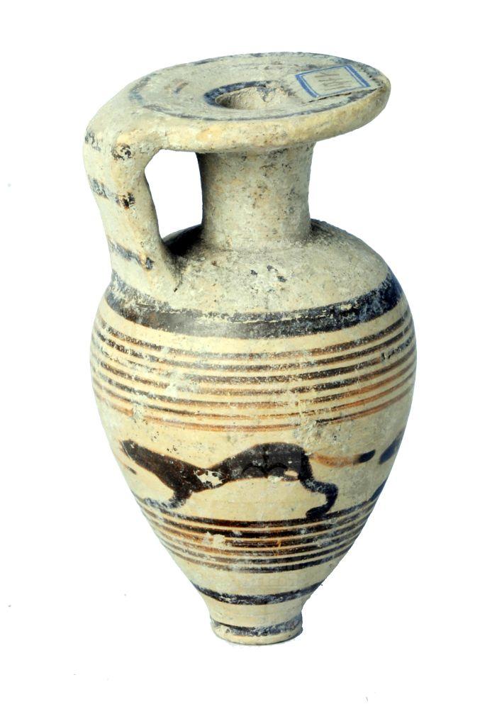 Aryballos piriforme rastremato verso il puntale a fasce con larga zona decorata da tre cani in corsa.