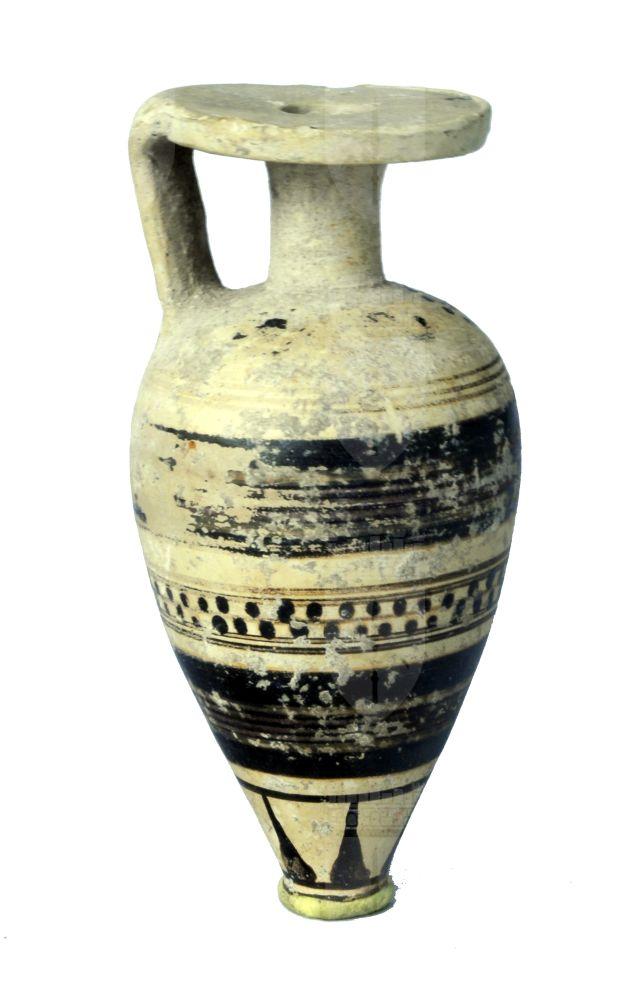 Aryballos piriforme rastremato verso il puntale a fasce brune, una con fila di punti.
