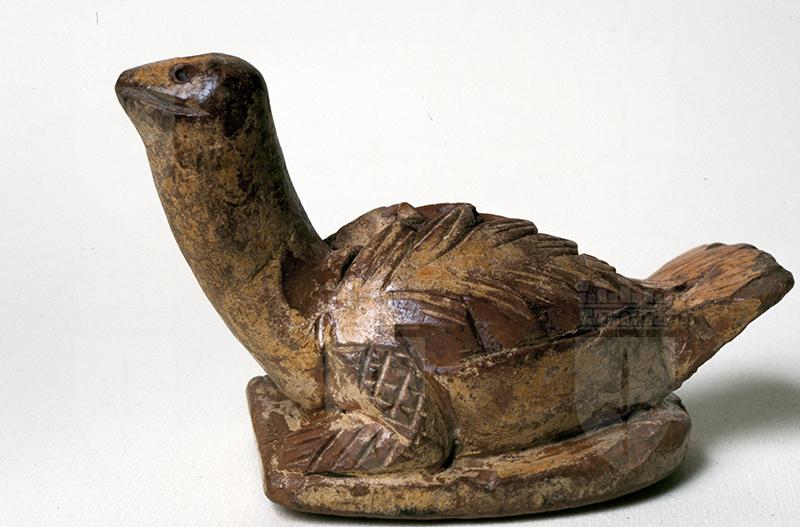 Su una base piana di forma ovale, tagliata orizzontalmente sul davanti, poggia una colomba ad ali chiuse, modellata in terracotta bruno rosata lavorata a stecca con abbondanti tracce del rivestimento bianco-ocra. Il piumaggio è reso con rilievo appena accennato e con incisioni a spina di pesce. Sul lungo collo la piccola testa ha occhi rotondi incavati e becco chiuso appena accennato. La coda a spatola e le grosse zampe, più simili a quelle di una tartaruga, piegate sotto il corpo dalla superficie segnata da un'incisione a reticolato. La figura è piena e la base presenta inferiormente incise una serie di linee parallele oblique intersecate da altre perpendicolari rese a trattini.