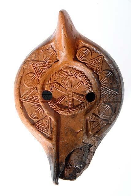 Lucerna africana. Mancante dell'estremità del becco. Nel campo i due «infundibula» sono spostati all'orlo; tra essi «chrismon» riempito da segmenti, con l'occhiello della «rho» a sinistra, in medaglione formato da corona di alloro. Sull'orlo sei decorazioni geometriche per parte: triangoli gemmati e patere alternati. Ansa piena puntuta. Sottofondo piatto con piedino circolare al cui centro due circonferenze concentriche, incise. Realizzata in argilla e vernice rossa con lavorazione in stampo doppio.