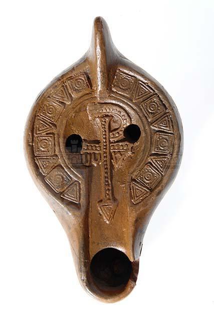 Lucerna africana. Ansa piena, puntuta. Nel disco concavo, a due «infundibula» leggermente obliqui, croce monogrammatica gemmata, con i bracci appena espansi; occhiello della «rho» aperto e asta verticale, che poggia su un triangolo gemmato; sotto l'asta orizzontale pendono le lettere apocalittiche Sulla spalla decorazione geometrica: quadri alternati a triangoli gemmati. Sottofondo piatto con piedino circolare in rilievo al cui centro sono incise due circonferenze concentriche.