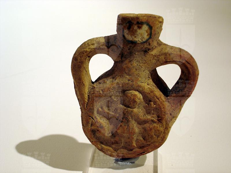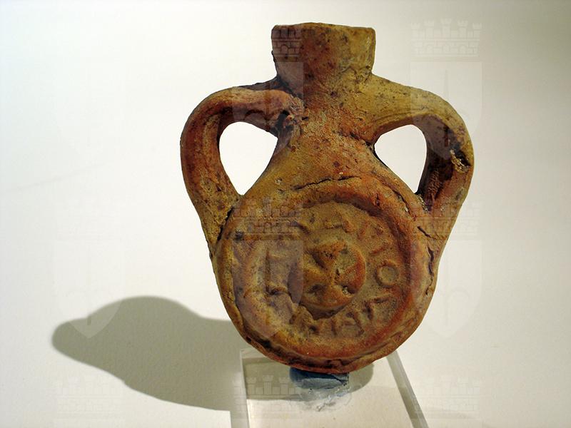 Ampolla realizzata in argilla di colore nocciola a forma di piccola borraccia biansata con ventre rotondo appiattito e collo cilindrico leggermente svasato. Sulle due facce discoidali raffigurazione resa da matrice abbastanza fresca. Lato A: bordo ad anello rilevato; nel campo il santo martire Menas in posizione di orante indossa la tunica corta stretta in vita, ma è sprovvisto della clamide.Nelle mani sono visibili le dita. La testa, resa come una massa indistinta, è affiancata a sx da una croce e a dx da un segno di difficile lettura. Lato B: al centro, racchiusa da un anello in rilievo, è una croce di Malta. Intorno, entro una sottile corona d'alloro reca un' iscrizione.