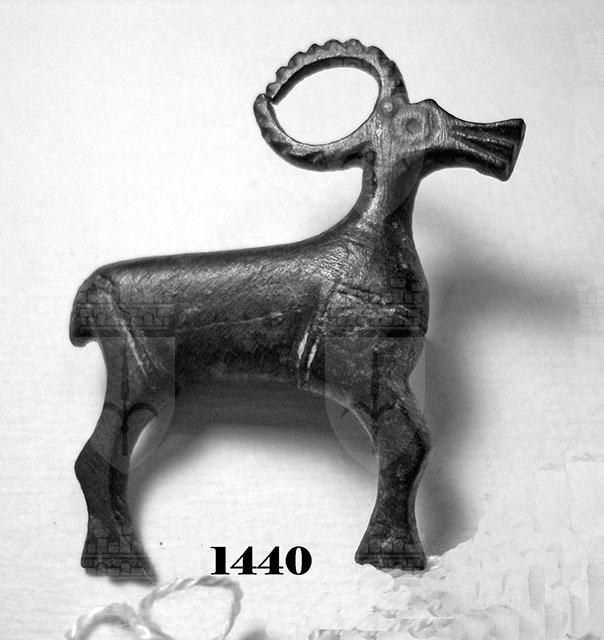 Fibula laminare a forma di cervo, priva dell'ardiglione; il corpo è decorato ad occhi di dado.