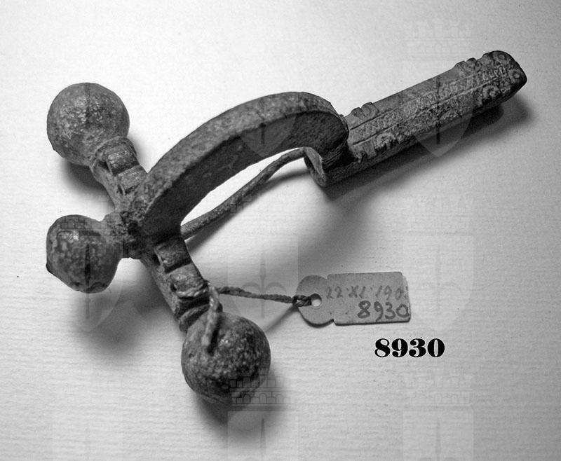 Zwiebelknopffibel del tipo Keller/Pröttel 3/4C. L'arco e la staffa presentano una linea a piccole croci, la staffa chiude all'estremità con due occhi di dado.