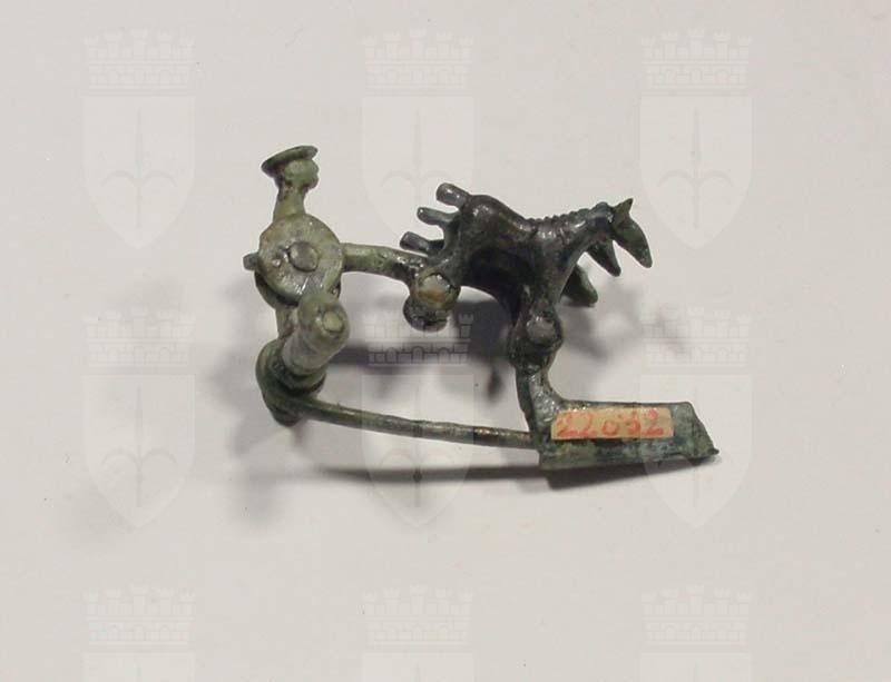 Fibula con arco configurato a guerriero su carro trainato da tre cavalli.