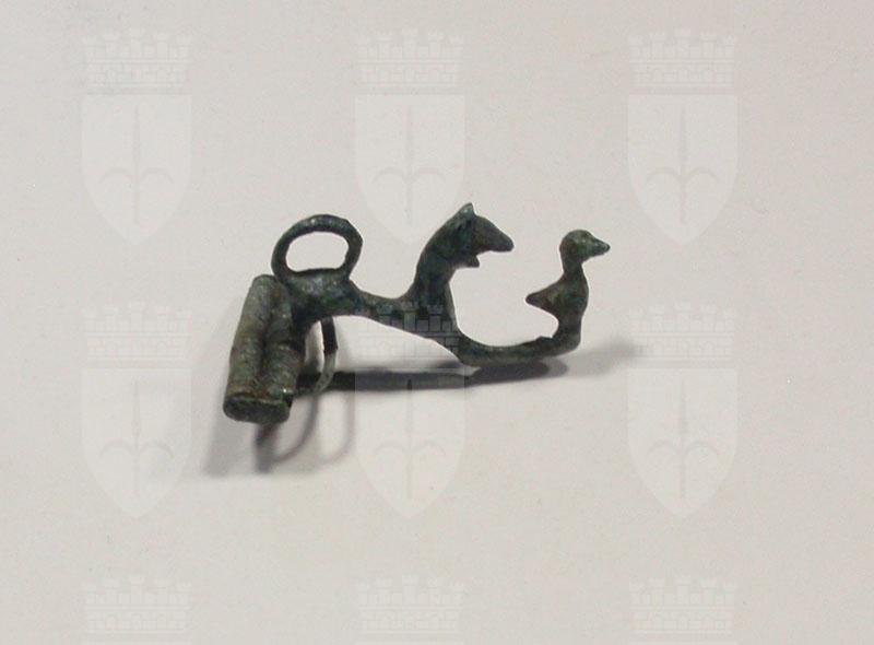 Fibula ad arco configurato a felino con anatrella all'estremità della staffa.