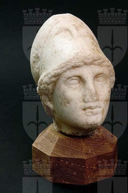 Piccola testa leggermente voltata a destra, dal volto pieno con occhi infossati e allungati tra palpebre a nastro sopracciglia appena arcuate; naso dal dorso piatto con radice larga avvicinata alla bocca, morbidamente serrata. I capelli a ciocche ondulate emergono sotto l'elmo corinzio, che presenta un piccolo foro alla sommità per sostenere il lophos.