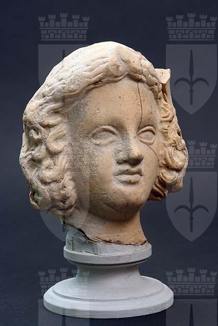 Testa di bambino dall'ampia fronte, occhi spalancati dalle palpebre a nastro, piccolo naso e bocca serrata. Ricca capigliatura a ciocche ondulate che si dipartono da una scriminatura centrale e formano un morbido caschetto ai lati del volto.
