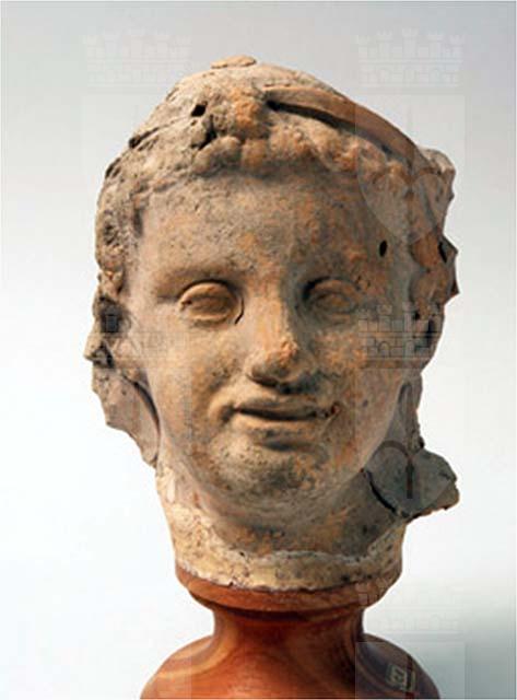 Testa di bambino con i capelli ondulati trattenuti da diadema dal quale scendono le bende sugli omeri.