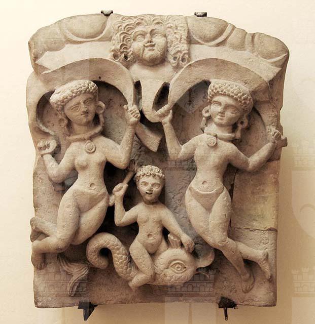 Frammento di altorilievo con due figure femminili nude, che nell'atto di danzare tengono un velo sopra la testa. Tra loro un amorino o erote cavalca un delfino; mentre nella cornice superiore ad ovuli, è inserito il volto della Gorgone. Il modellato morbido dei corpi, le proporzioni e i volti caratterizzati, ma impersonali, avvicinano questo pezzo alla scultura delle cappelle di Eracleopoli Magna (odierna Ehnasia El Medinet, nel Fayum). Questa scultura architettonica doveva decorare una nicchia, probabilmente di una cappella.