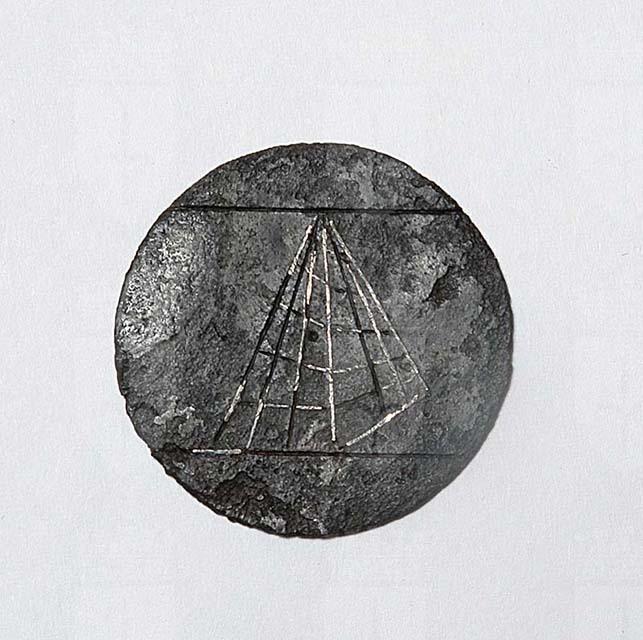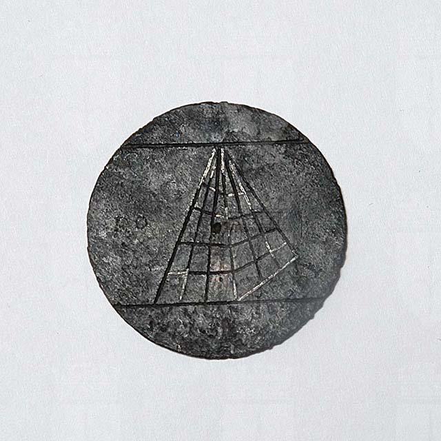 Il piccolo dischetto circolare conserva su ambo le facce la figura di una piramide o analemma per la lettura delle ore con l'indicazione dei diversi mesi dell'anno, rispettivamente alla latitudine di Roma (RO) da una parte, e di un'altra città forse Ravenna (RA) dall'altro. Per venir usato doveva essere probabilmente inserito in un cilindro di analogo materiale. Tracce d'argento nelle incisioni dell'analemma.