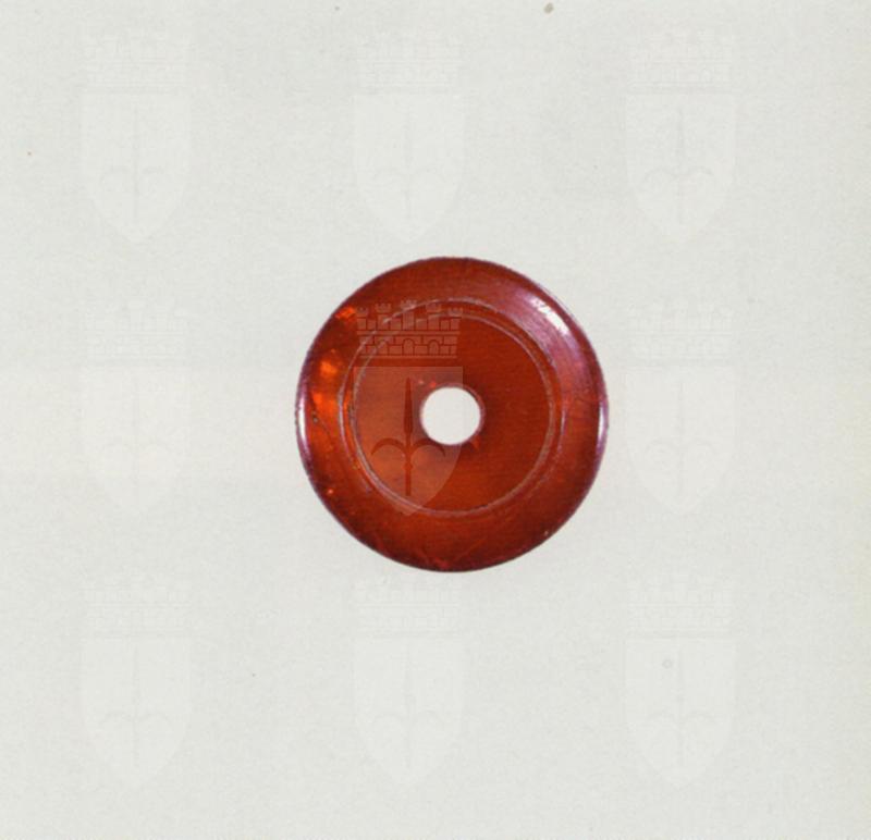 Dischetto a bottone rotondo con due facce piane, forato al centro, con un solco circolare a tornio su ogni faccia.