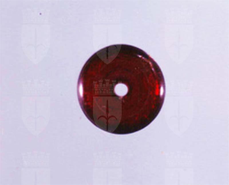 Dischetto realizzato in ambra scura rossastra con una faccia piana e l'altra leggermente convessa, con foro centrale. presenta come decorazione una doppia incisione concentrica al torno sulla faccia piana, una sulla convessa e una sul bordo.