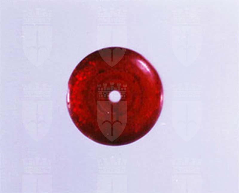 Dischetto in ambra dorata con due facce convesse ai bordi e concave al centro, con foro centrale. Decorata con doppia e tripla incisione concentrica sulle due facce.