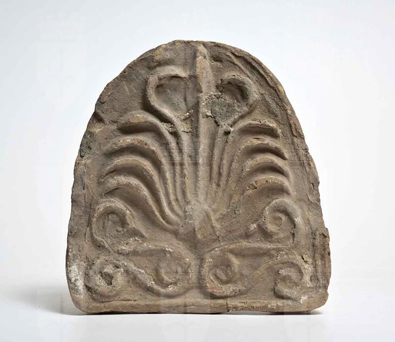 Argilla di color beige, in frattura di colore rosato. Rare tracce di biancastro su petali, volute e sfondo. Un listello funge da contorno della lastra; alla base vi sono due elementi terminanti alle estremità in volute, da cui spuntano altri due elementi, che si sviluppano orizzontalmente e terminano in volute, e un triangolo; da questo spuntano undici petali sottili e incavati: il centrale è dritto fino al bordo superiore, i due laterali a questo si curvano verso l'interno, i restanti verso l'esterno.