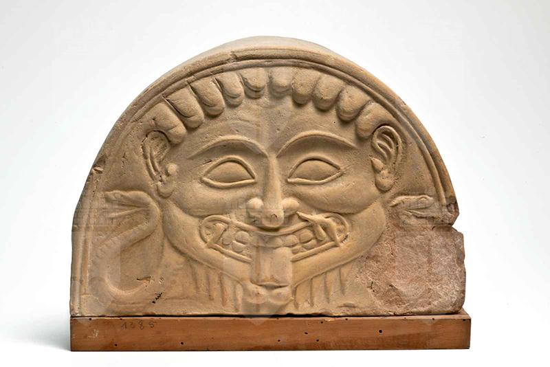 Argilla rosata, mentre in frattura assume un colore rossastro. Sono presenti tutti gli elementi canonici del gorgoneion arcaico, dalle mascelle spunta un serpente per lato.